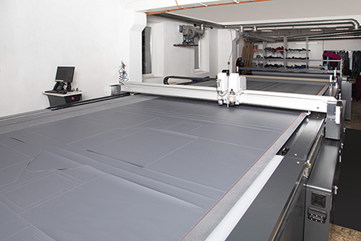 Раскройный участок ткани ПВХ перерабатывает до 1 млн. кв. м. ткани ПВХ в год и оснащен двумя промышленными машинами автоматического цифрового раскроя с интеллектуальной системой управления и лазерным контролем. Конвейерная система подачи ткани, три модуля с тремя инструментами позволяют нам одновременно производить раскрой материала с лазерной точностью, а также наносить конструкторскую и сборочную разметку на выкройки.
